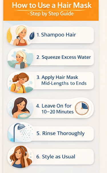 Learn how to use a hair mask the right way. Step-by-step guide for dry, damaged, and growth-focused hair, including protein, keratin, bonding, heat and color protection.